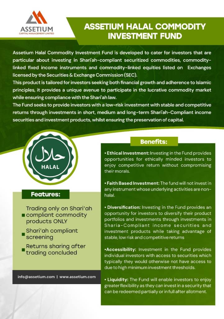 Assetium Halal Commodity Investment Fund is developed to cater for investors that are particular about investing in Shari’ah-compliant securitized commodities, commodity-linked fixed income instruments and commodity-linked equities listed on Exchanges licensed by the Securities & Exchange Commission (SEC)